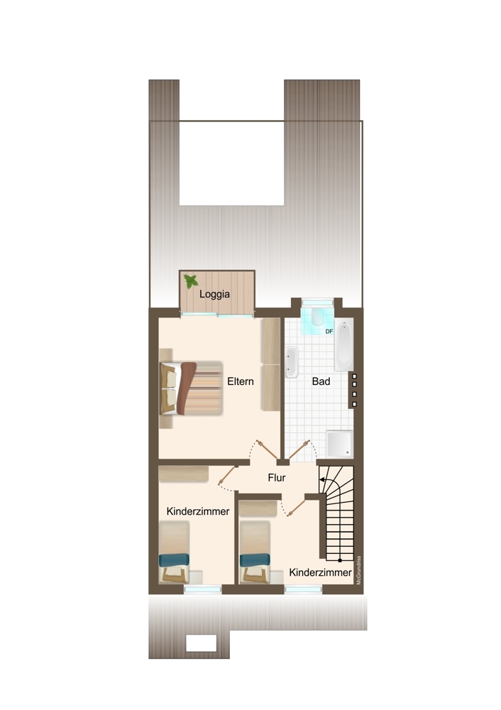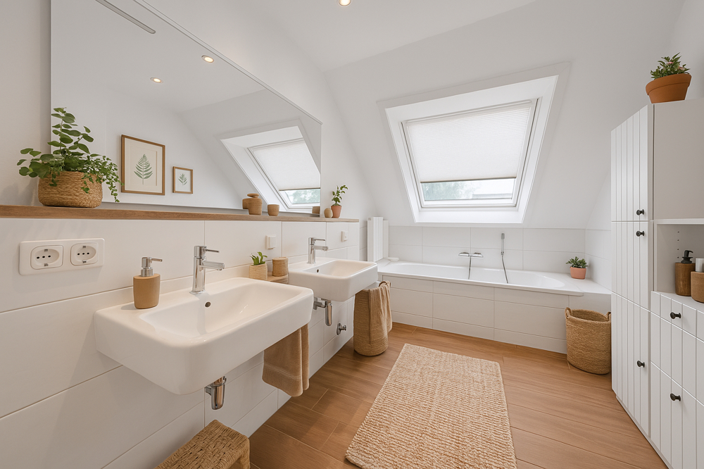 Über eine Treppe gelangen Sie in das Dachgeschoss, wo sich das moderne Badezimmer mit sowohl einer Badewanne als auch einer Dusche befindet. Drei weitere Räume bieten flexible Nutzungsmöglichkeiten als Schlaf-, Gäste- oder Arbeitszimmer. Ein besonderes Merkmal ist der Zugang zu einem wohnlich ausgebauten Spitzboden aus einem der Räume. Der Spitzboden bietet zusätzlich etwa 12 Quadratmeter Nutzfläche, die ideal als ruhiger Arbeitsplatz, gemütlicher Lesebereich oder als zusätzlicher Stauraum genutzt werden kann. Das Highlight des Dachgeschosses ist das Hauptschlafzimmer mit einer eigenen Loggia, die einen wunderschönen privaten Rückzugsort darstellt.