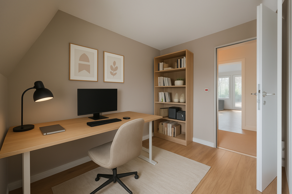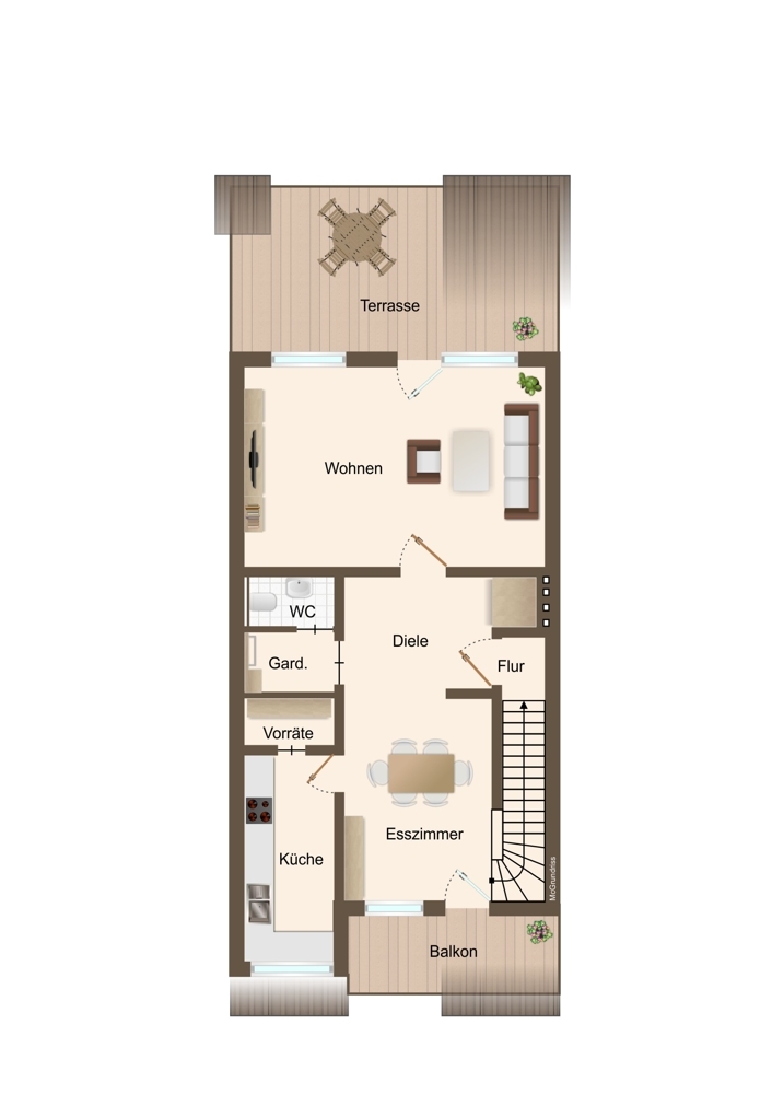 Die Küche ist funktional gestaltet, komplett ausgestattet mit hochwertigen Einbaugeräten und bietet zusätzlichen Stauraum in einem praktischen Abstellraum. Ein Gäste-WC rundet das Raumangebot auf dieser Etage ab und bietet Komfort für Ihre Besucher.