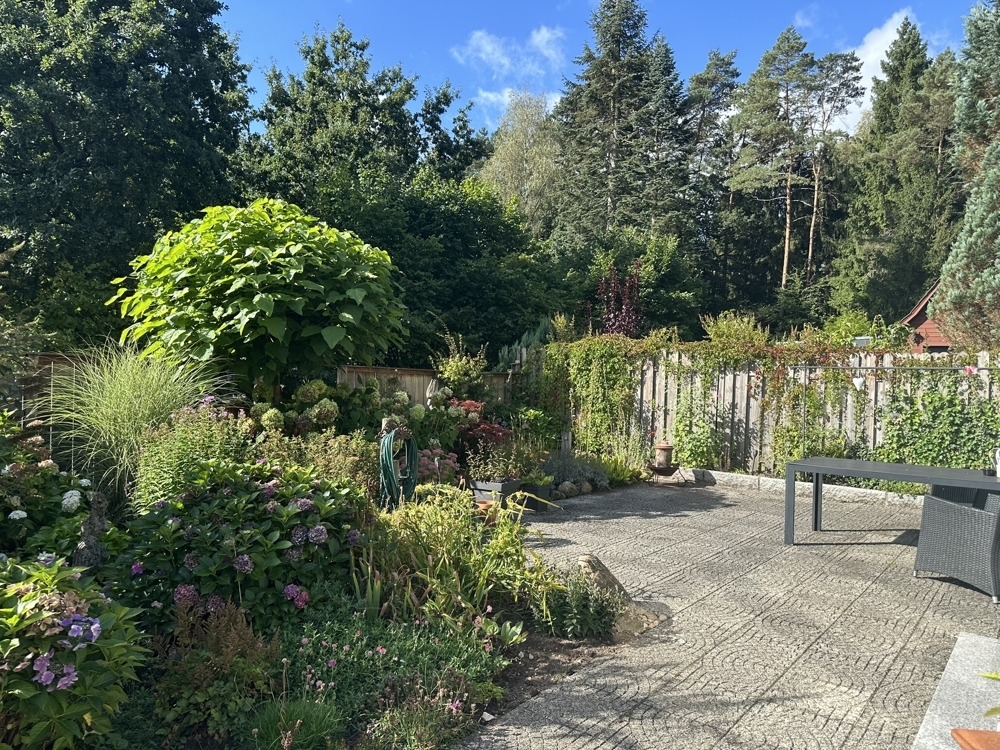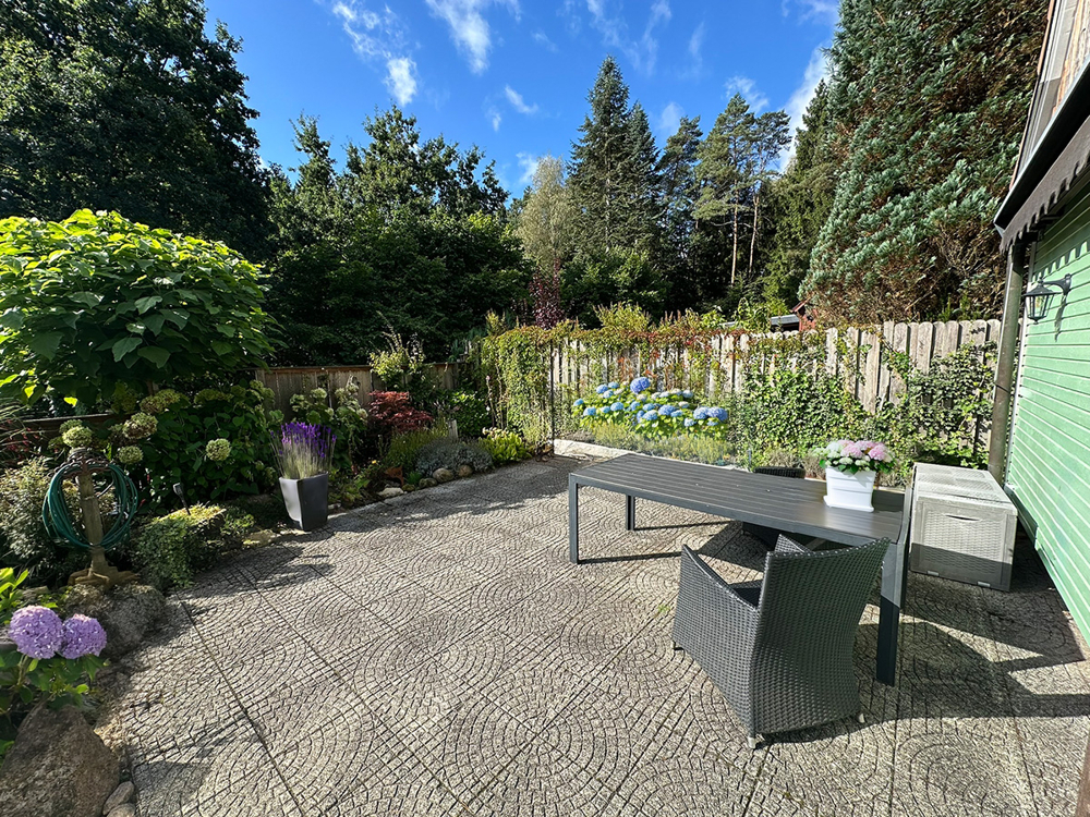 Das Grundstück ist pflegeleicht angelegt und bietet mit seinen Rasenflächen, der schönen Terrasse, den Beeten und dem alten Baumbestand viel Platz für Erholung, Spaß und Freizeit.