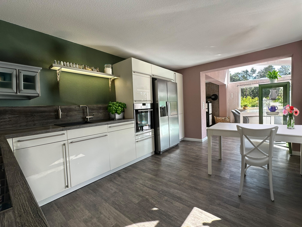 Bereits beim Betreten empfängt Sie ein freundlicher Eingangsbereich mit genügend Platz für eine Garderobe. Das Herzstück des Hauses bildet der großzügige Wohn- und Essbereich mit offener Küche, der durch große Fensterflächen lichtdurchflutet ist und eine warme, einladende Atmosphäre schafft. Der moderne Kaminofen sorgt nicht nur für wohlige Wärme und zusätzliche Behaglichkeit, sondern überzeugt auch durch seine praktische Funktionalität: Dank seiner Wasserführung wird die erzeugte Wärme direkt in das Heizsystem eingespeist und so effizient im gesamten Haus genutzt.
