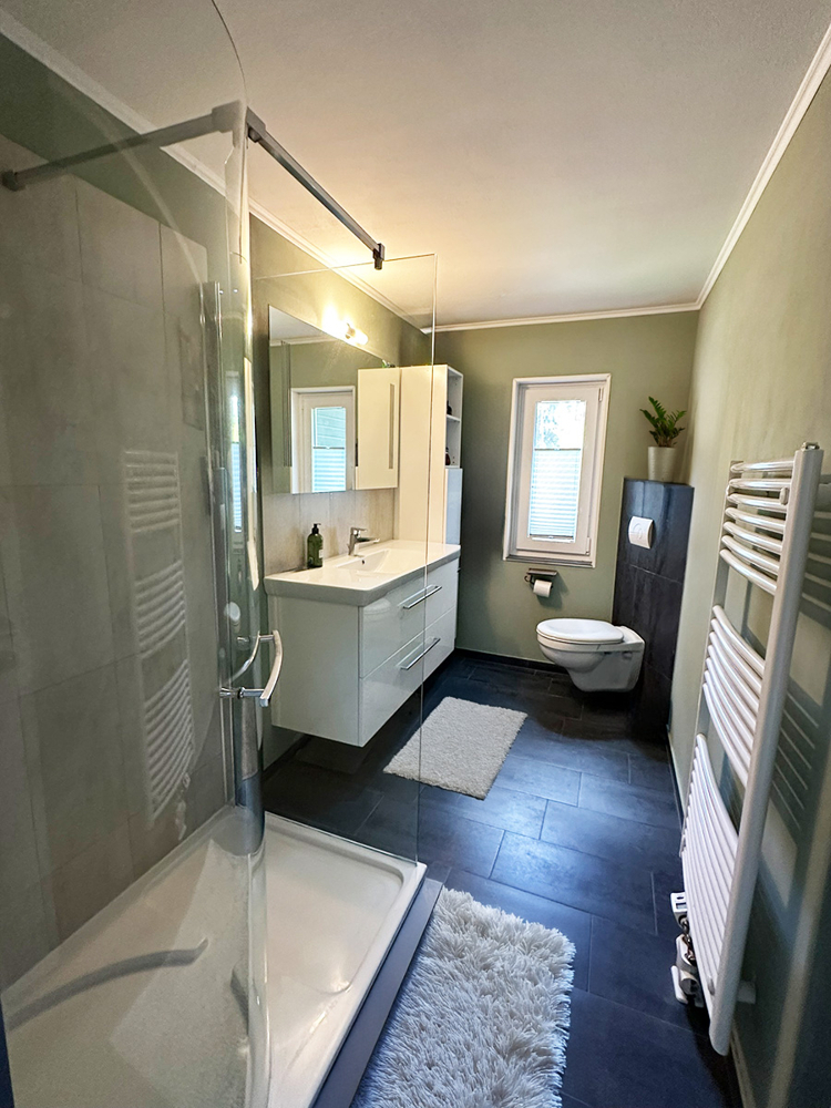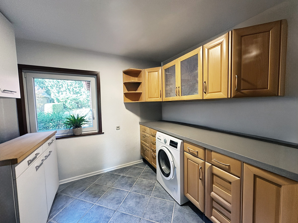 Im Erdgeschoss befinden sich außerdem ein modernes Duschbad, ein Wohn/-Schlafzimmer sowie ein praktischer Hauswirtschaftsraum mit Waschmaschinenanschluss und Stauraum.