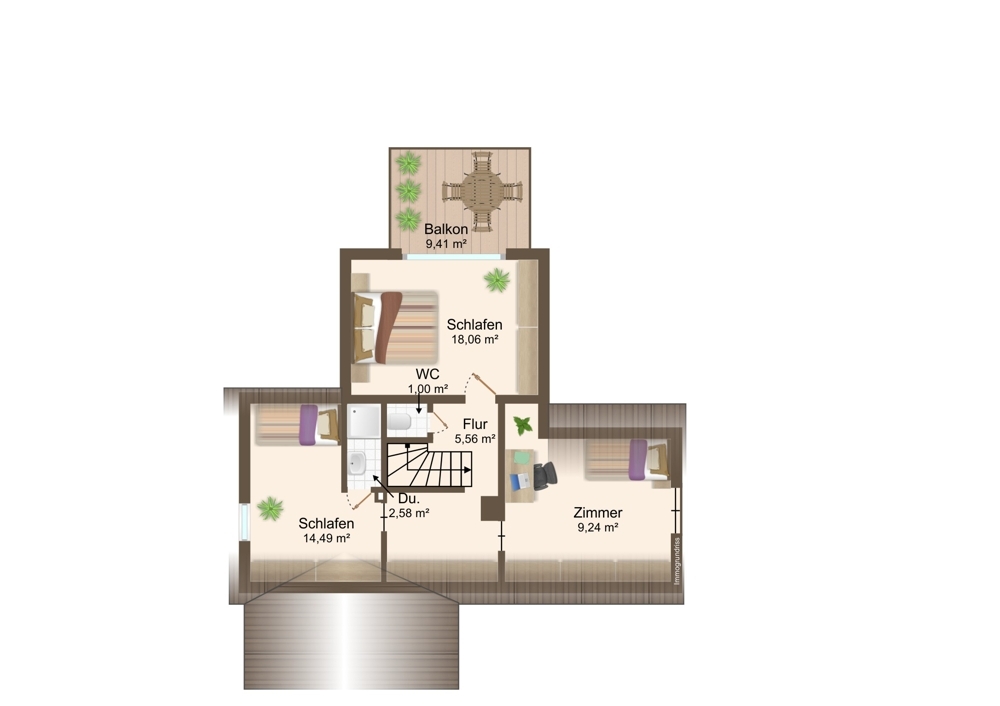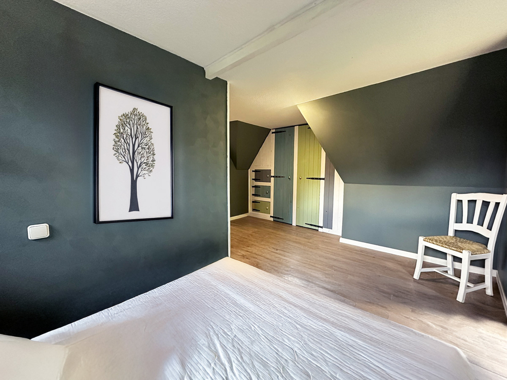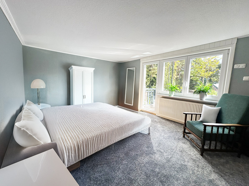 Über eine offene Holztreppe erreichen Sie das Obergeschoss mit einem großzügigen Schlafzimmer, das Zugang zu einem Balkon bietet. Von hier aus genießen Sie den Blick ins Grüne und starten mit frischer Luft in den Tag.